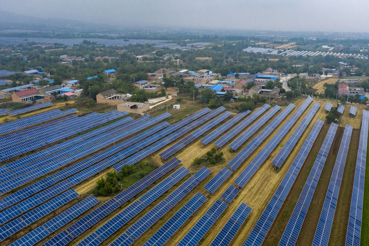 2025年6月25日在山西省运城市芮城县夭上村拍摄的光伏基地(无人机照片)。新华社记者杨晨光摄